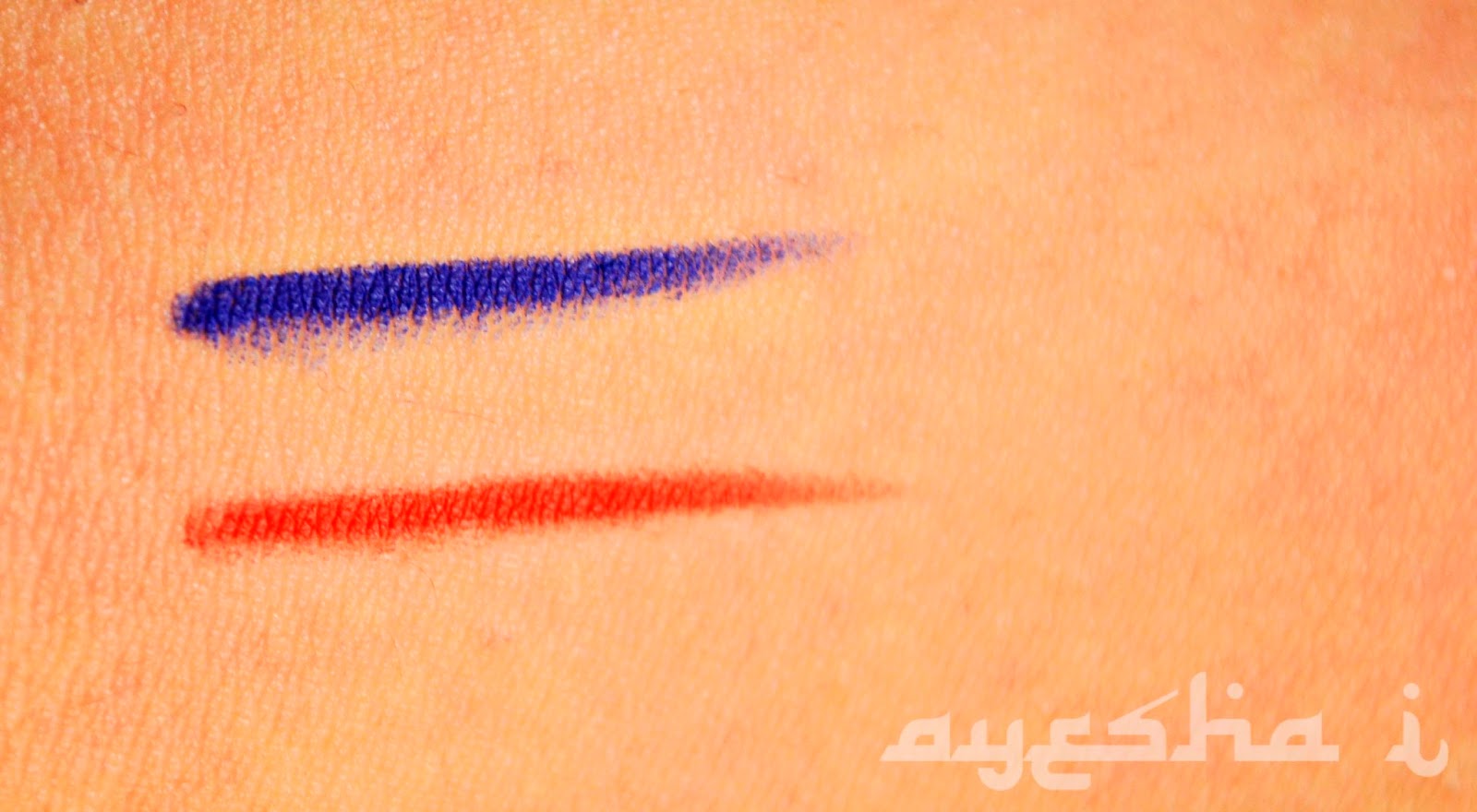The application is also smooth and these set matte lasting a good 5-6 hours on my oily eye lids before starting to fade so I recommend an eye primer underneath to increase wear time. On my waterline, the liner in Royal Blue stays intense for 4 hours before fading. My only complaint with these is though, that they might transfer from your lashline to above the crease with time hence again, these would wear best with a primer underneath. Once these fade away, they do so evenly. I wear the shade Bright Orange as a lip liner too and it lasts amazingly! These haven't irritated my eyes in any way at all and unlike some cheap pencils these don't deposit wooden bits of sharpening in your eye or anywhere for that matter. The swatch on my arm has lasted all day now and it won't come off until I remove it myself.